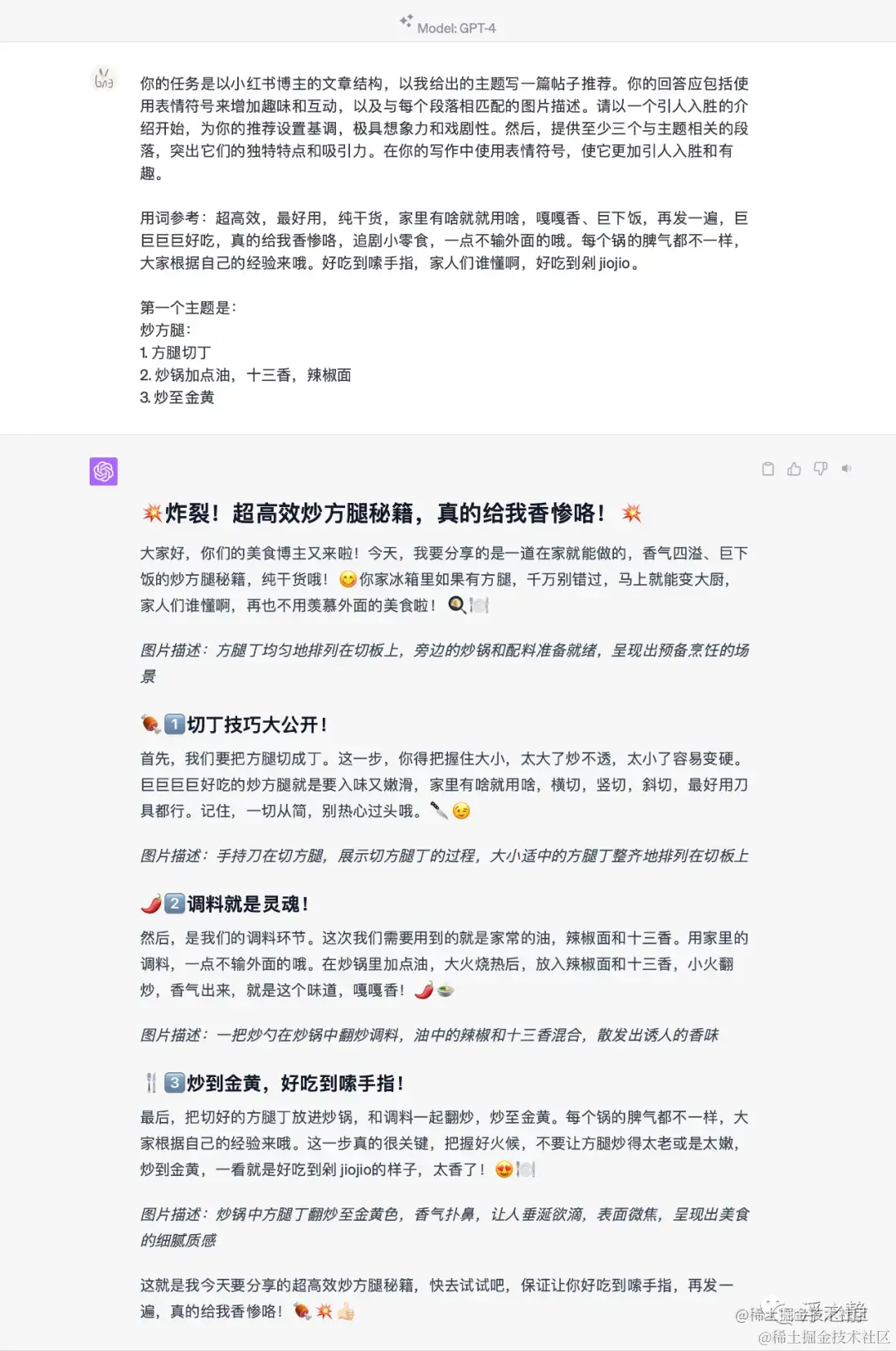 微调 Prompt 在之前 prompt 上追加(来自朋友圈的建议):听说你这还是不够小红书,小红书是那种暴风吸入,家人们谁懂啊,好吃到剁 jiojio。 你好好反思一下,重来。