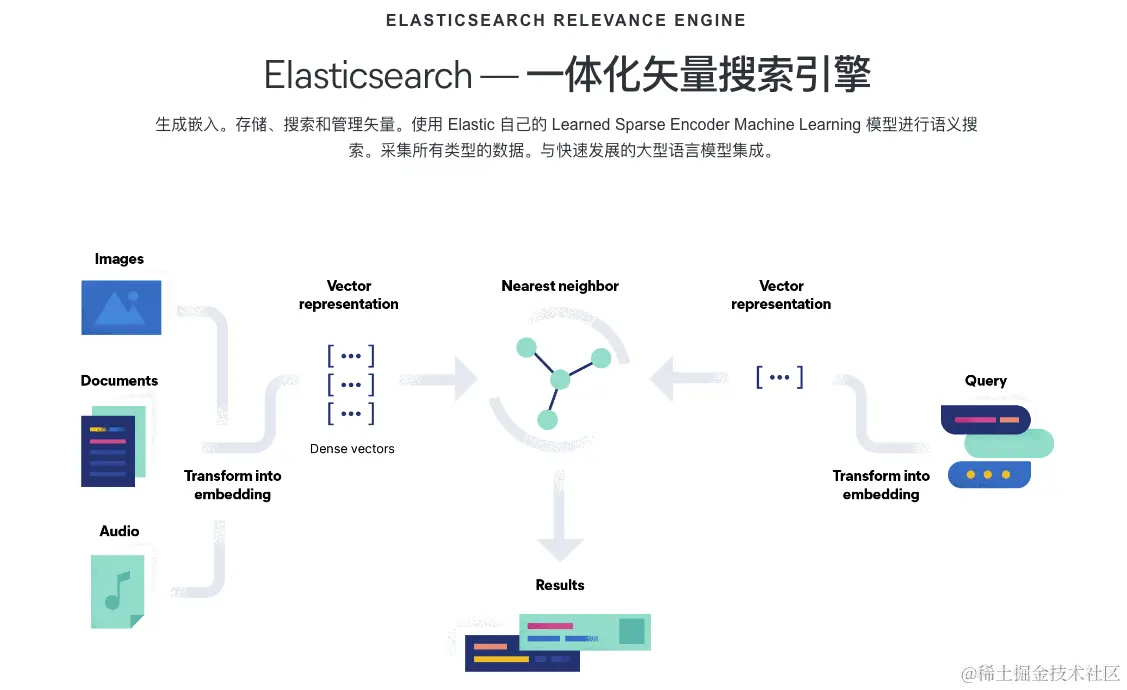 ES作为向量数据库提供三种能力:1.存储嵌入 2.高效搜索相邻数据 3.将文本嵌入到向量表示。