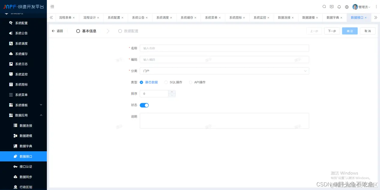 JNPF 可接入三种数据源,数据库、API 及第三方工具,通过 JS 把后端调的数据与前端组件相映射,快速搭建灵活的数据管理工具。