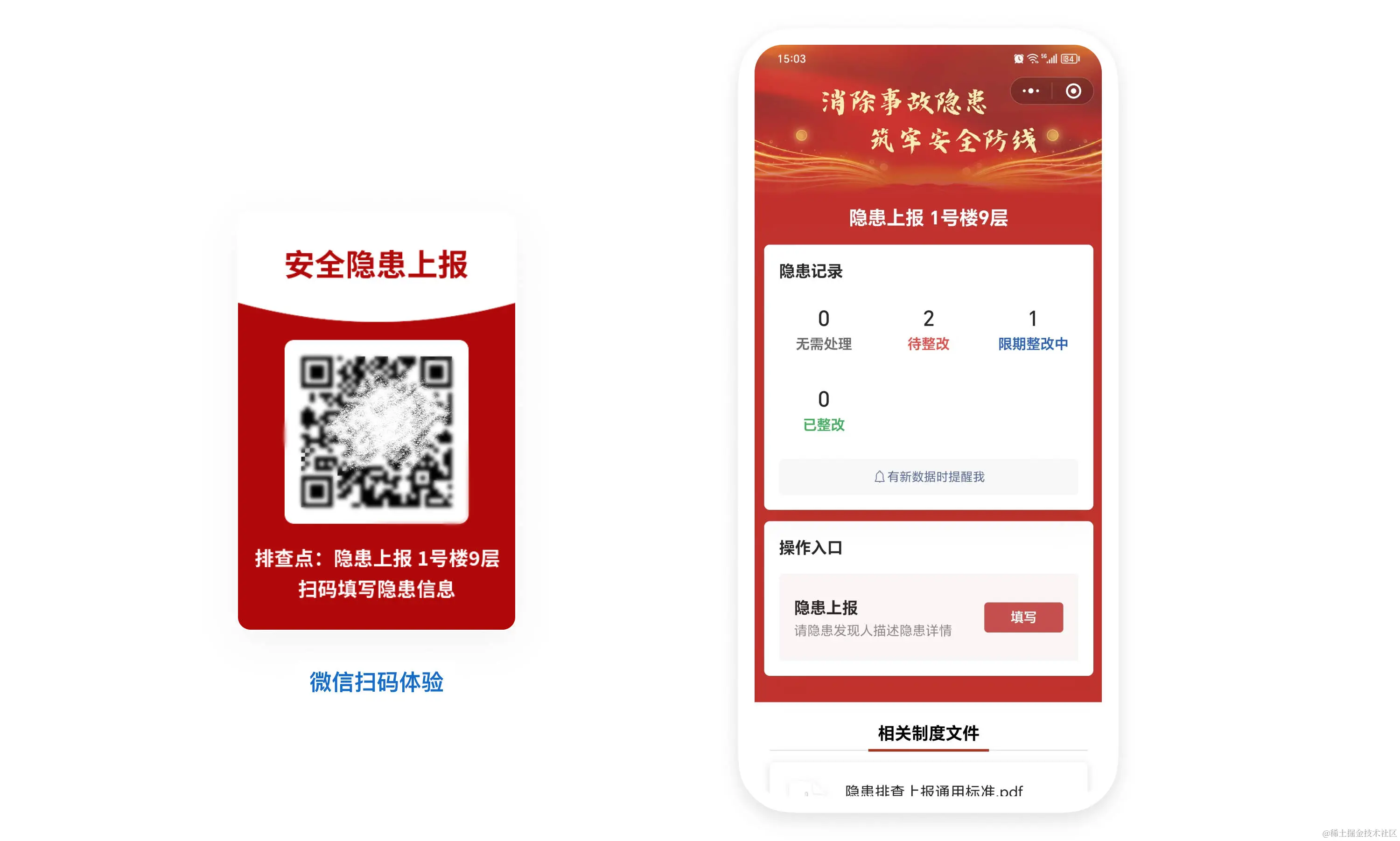 可以在草料上搭建隐患上报系统,员工扫码即可上报隐患线索,管理人员可实时收到消息提醒,安排对应责任人进行整改。此外,可以在二维码中对隐患问题进行拍照、视频记录,从而体现问题整改前后的对比,确认整改效果。