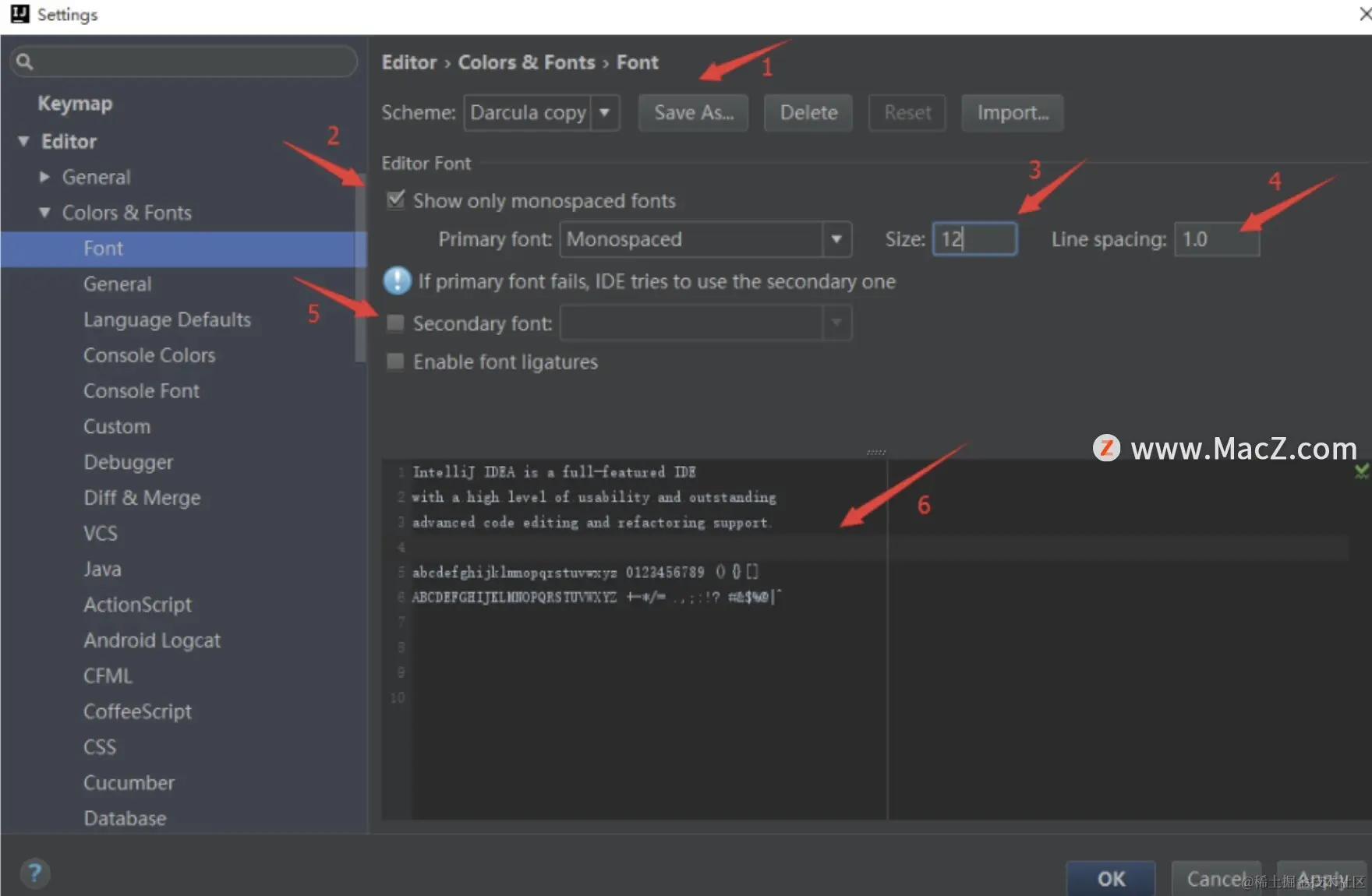 如修改上图,我们定位到如图所示的Editor > Colors & Fonts > Font界面,如图所示的标注1Save As表示我们需要另外复制一个编辑区主题,然后才能,因为IntelliJ IDEA是不能直接在默认的代码模板上字体的;如图所示的标注2的Show only monospaced fonts表示只显示系统上的等宽字体,取消勾选后,将显示系统上所有已安装的字体。标注5所示的表示第二字体Secondary font,因为IntelliJ IDEA的编码字体有「第一字体」和「第二字体」之分,当有些字符在第一字体不能支持的时候,将会自动使用第二字体进行支持。在这里,选择我们为,演示一下修改后的Size效果16: