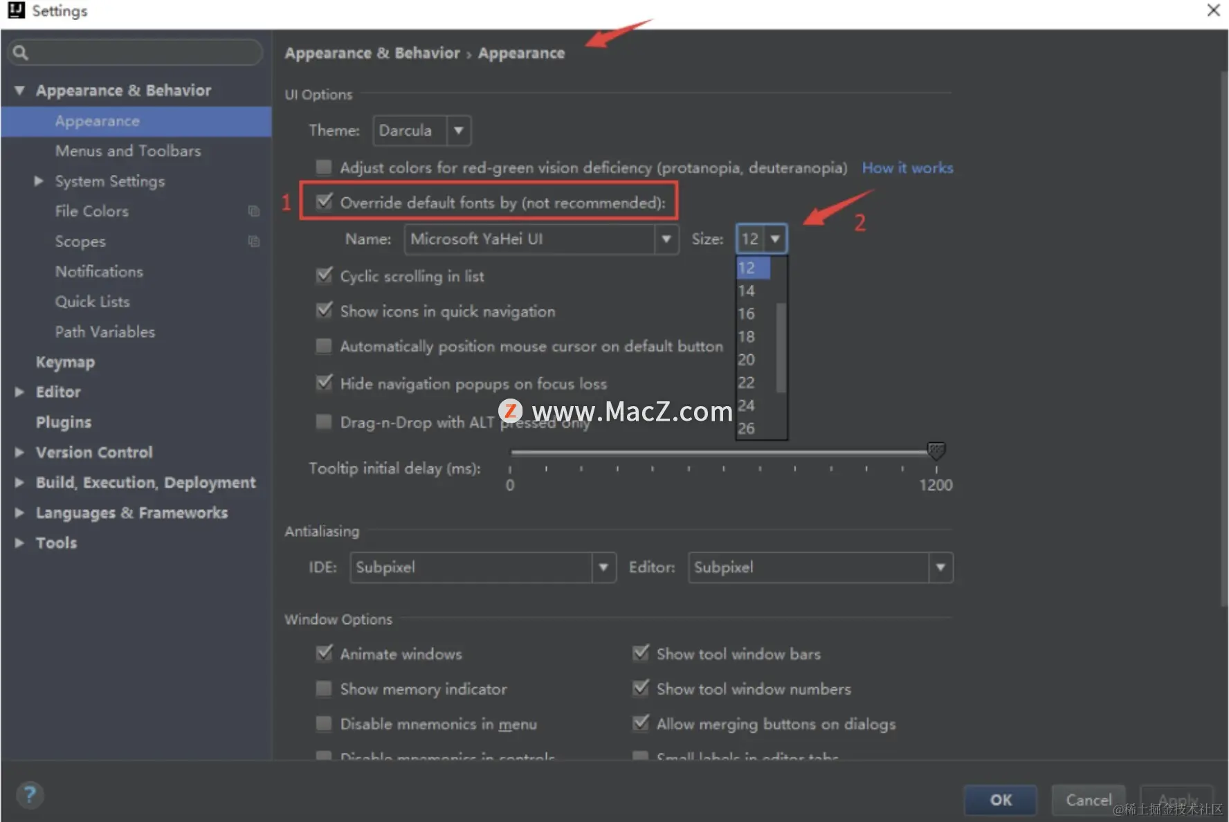 如上图所示,我们定位到Appearance & Behavior > Appearance界面,如果确定要修改字体大小的话,标注1所示的Override default fonts by XXX为必选项,否则,不能修改字体,因为IntelliJ IDEA默认是不推荐的;标注2所示的为必选我们具体可以修改字体大小的数值。在这里,选择Size为14,练习一下修改后面的效果: