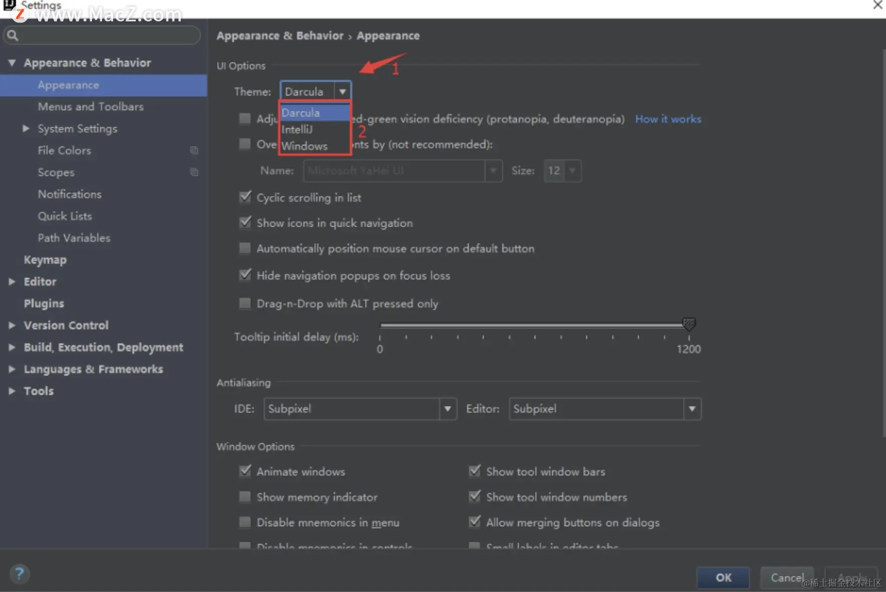 标注2:、Darcula和IntelliJ,Windows三个主题。