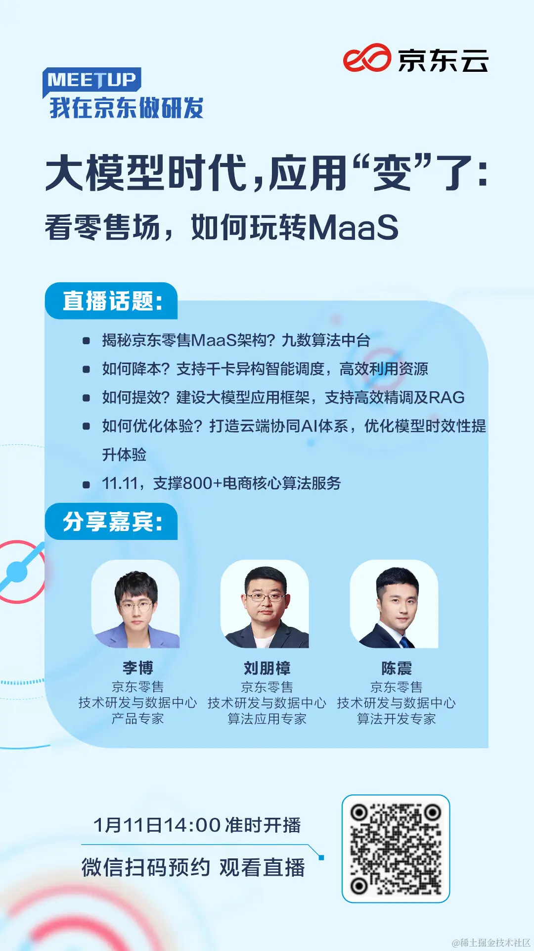 直播预告丨看零售场,如何玩转 MaaS 京东云开发者 2024-01-10 1,122 阅读1分钟 今年,有一个被频繁提及的词是MaaS 这类工具正在帮助千行百业实现大模型落地产业 在零售场,特别是像京东这样拥有超高并发、超复杂协同的电商场内 也沉淀出了一套通用的AI基础设施——九数算法中台 从提升客户服务体验、平台效率出发,训练各类垂直场景类型,支撑800+电商核心算法服务 并应用于11.11、12.12大促中,成效显著 这一期,我们谈论的话题与此有关 1月11日(周四)14:00-15: 00 京东云视频号直播,欢迎收看