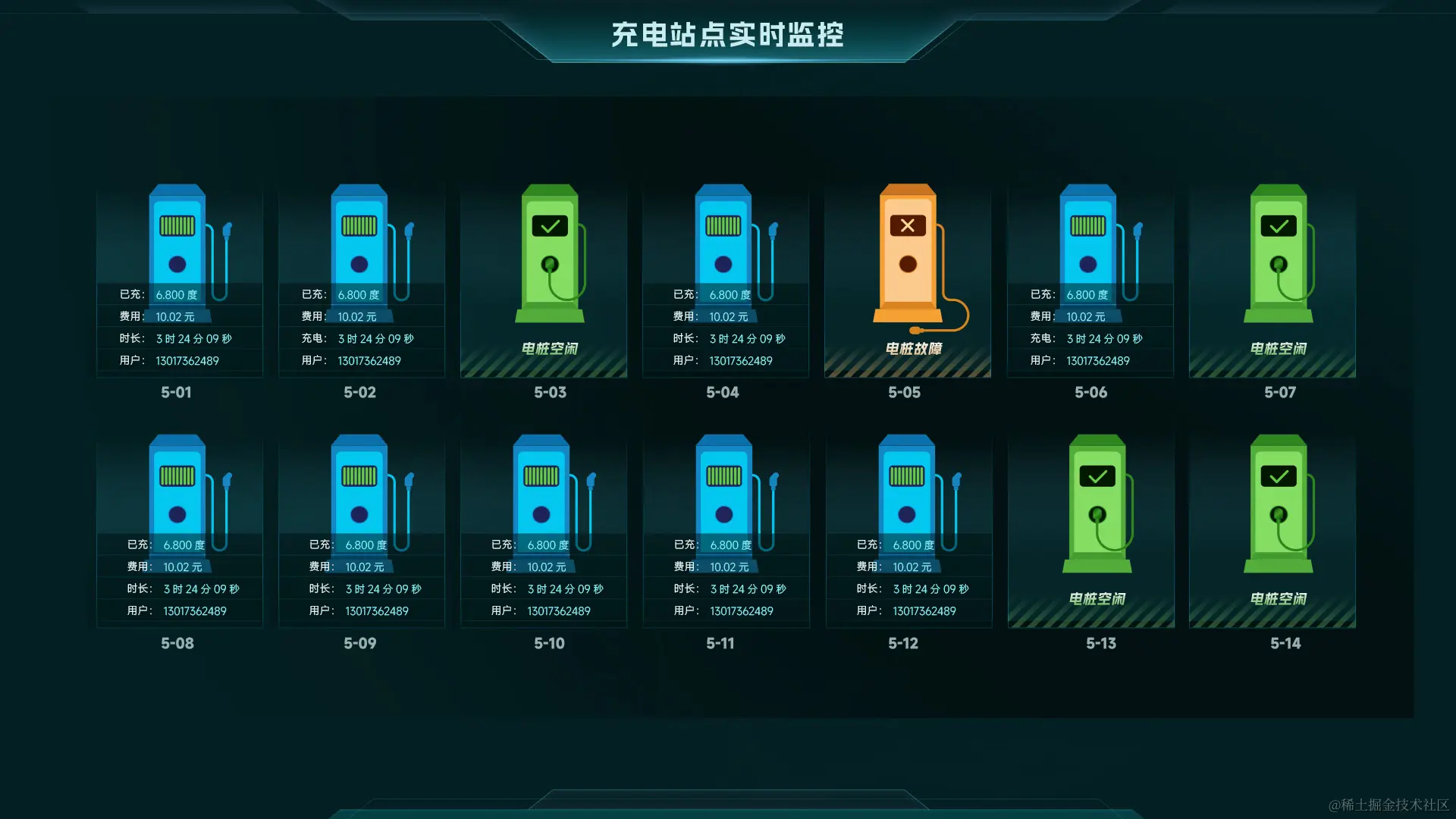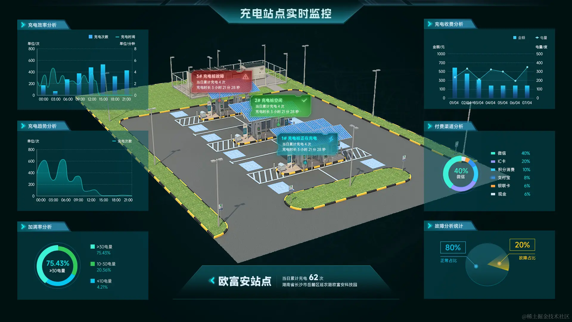 智慧充电桩通过数字孪生和可视化技术,构建充电站三维可视化场景,实时监测和管理充电桩的状态、诊断故障、调整参数等,为充电运营商和用户提供更好的充电体验。