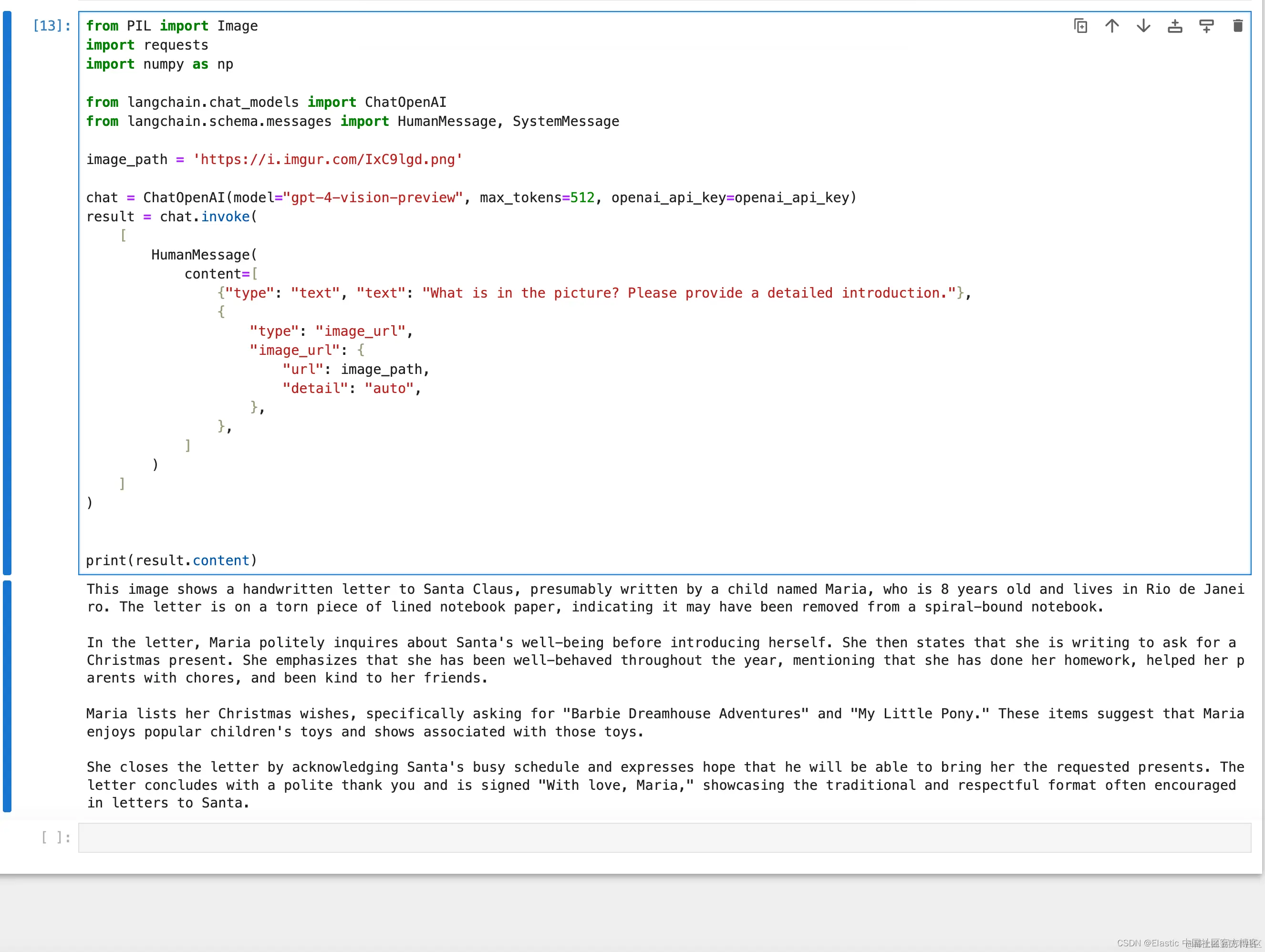 接下来,圣诞老人使用圣诞信件的数字化图像编写了一个脚本,使用 “gpt-4-vision-preview” 提取文本。 这一关键步骤将手写文字转变为数字文本。 “GPT-4-vision-preview” 是 OpenAI 的 GPT-4 语言模型的实验版本,扩展后包含图像处理和分析功能。