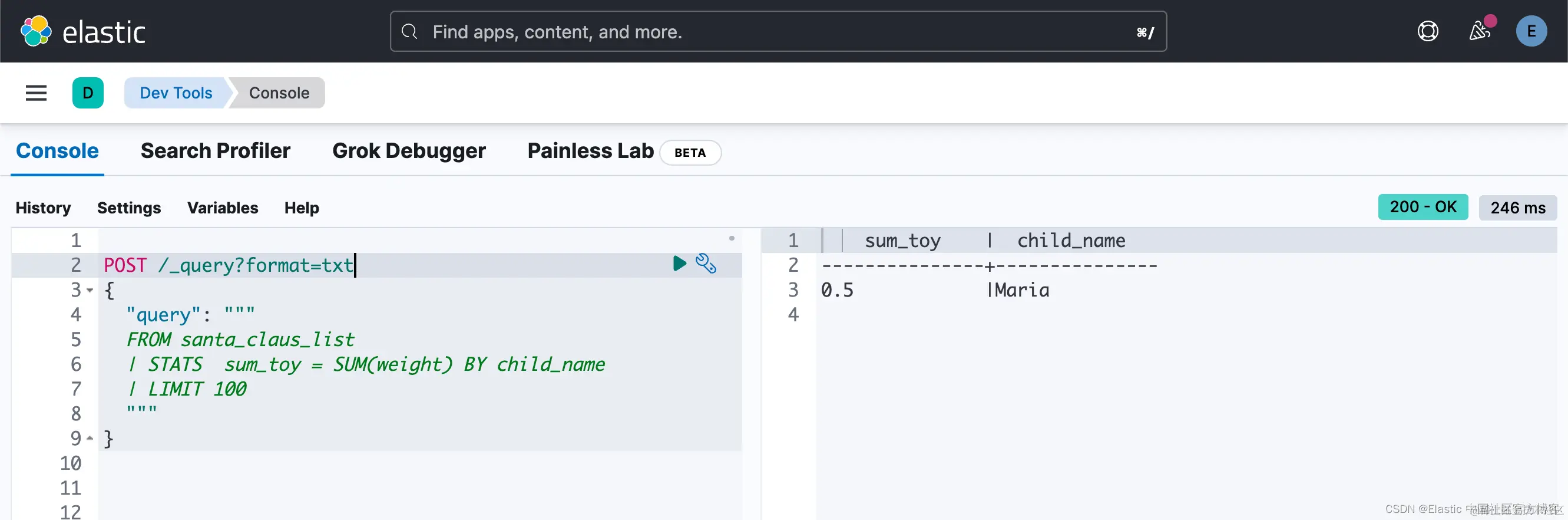 使用 Dev Tools(集成到 Kibana 中的工具),圣诞老人和精灵可以轻松搜索和分析数据。 这样可以清楚地了解今年的礼物趋势、信件最常出现的位置,甚至可以识别那些表达特殊或紧急愿望的信件,当然还有礼物的重量。 正如使用 ES|QL 的查询一样 (你需要安装 Elastic Stack 8.11 及以上版本才可以使用 ES|QL)。