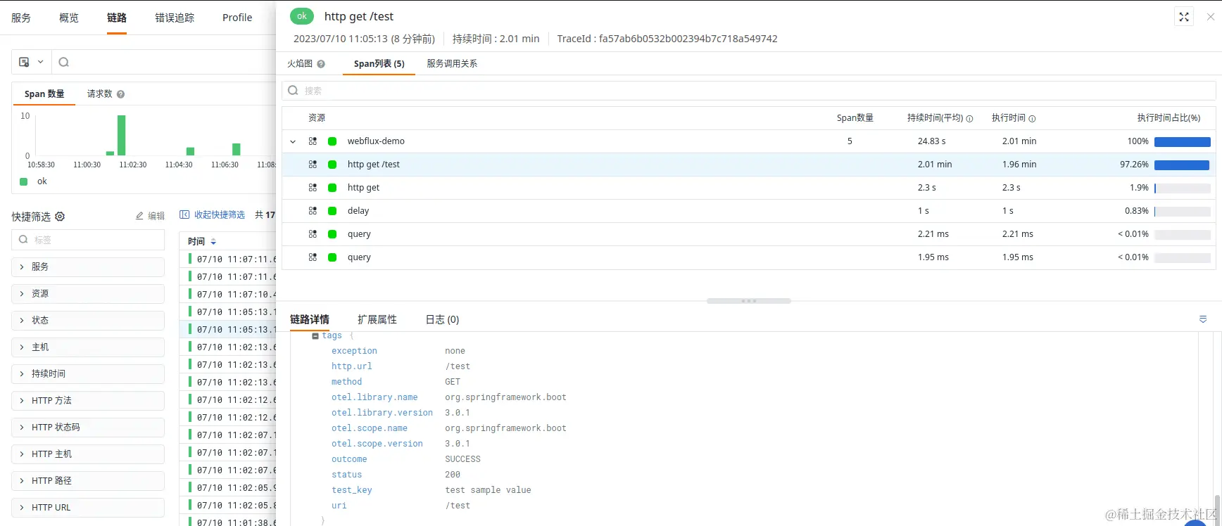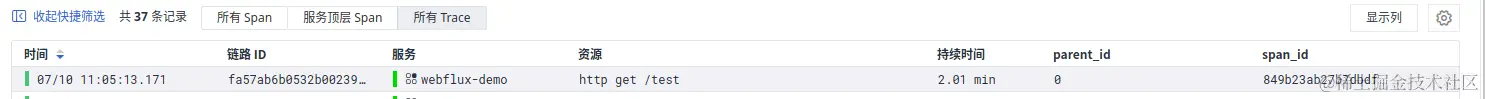 通过上面的代码调整后重新调用 endpoint,我们在观测云中可以看到WebClient的跨度。Micrometer Tracing 还将自动为包含trace_id. 例如,如果我们调用另一个带有链路追踪功能的微服务,它可以获取 ID 并向观测云发送附加信息。