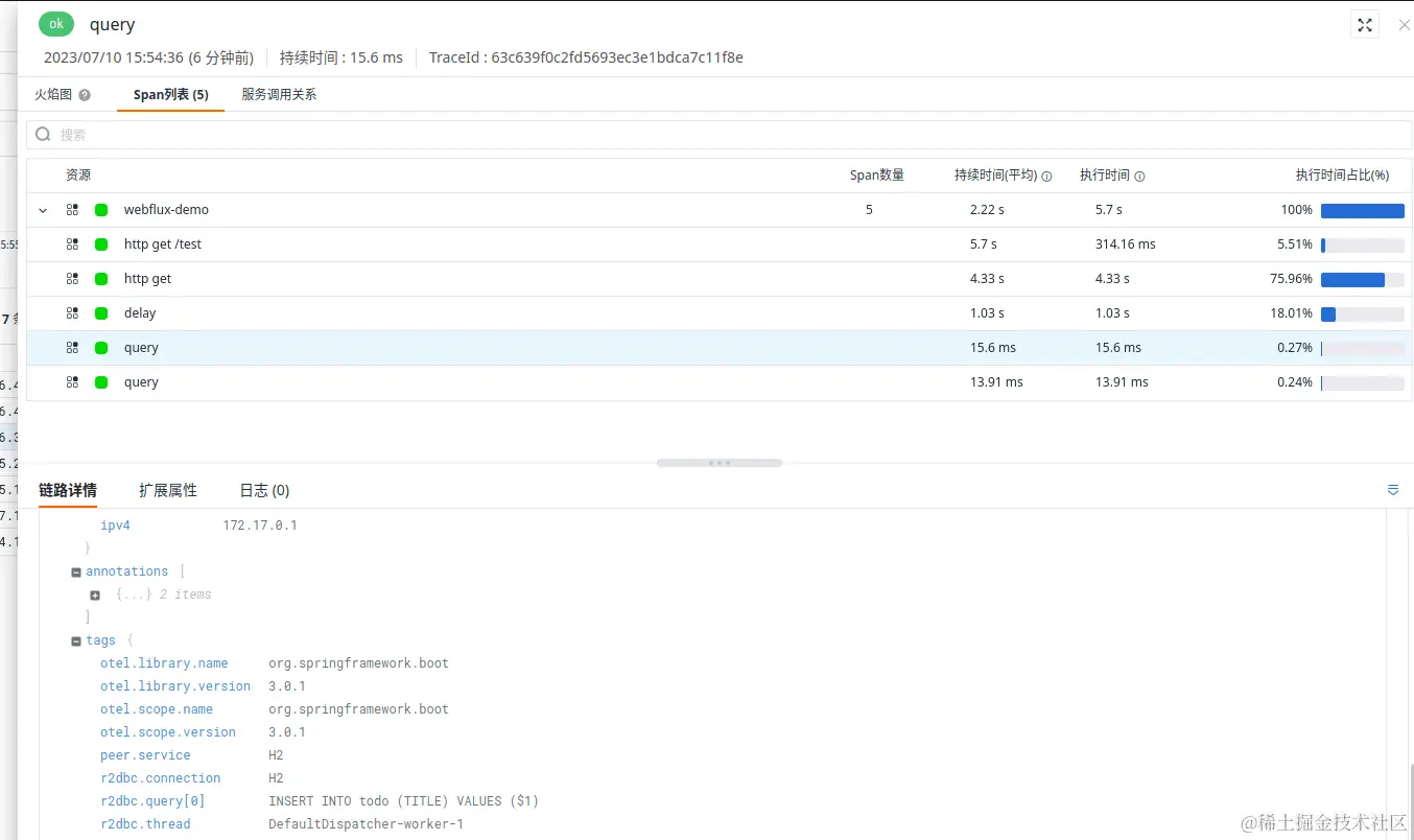 调用我们的 endpoint 将会再添加一个跨度。新的跨度名为query,包含多个标签,包括Spring Data R2DBC 执行的 SQL 查询。