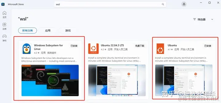在Microsoft Store中搜索wsl,安装wsl和ubuntu,也可以用命令行安装,但实测Microsoft Store安装会快很多。