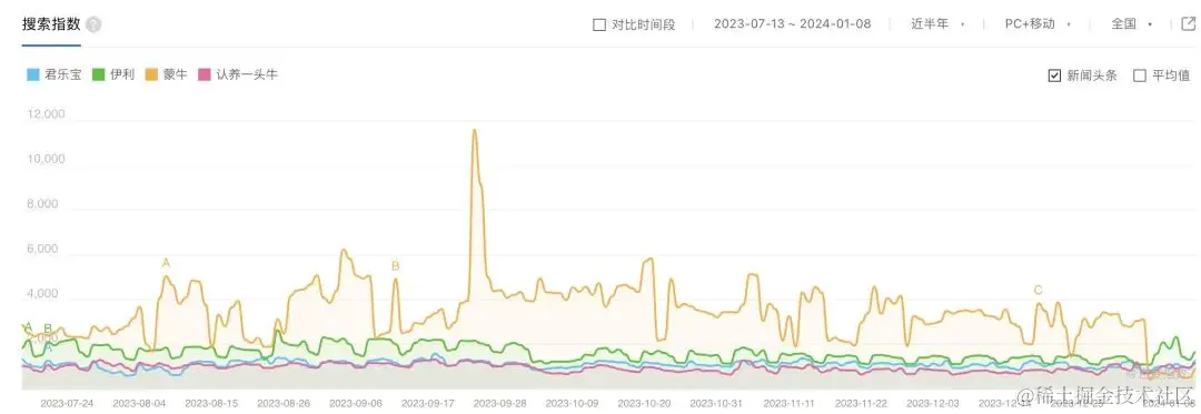 根据百度指数近半年的数据,在蒙牛、伊利、君乐宝、认养一头牛一众乳企中,君乐宝的热度表现并不逊色,不仅持续领先于认养一头牛,与伊利之间的差距也不算大。