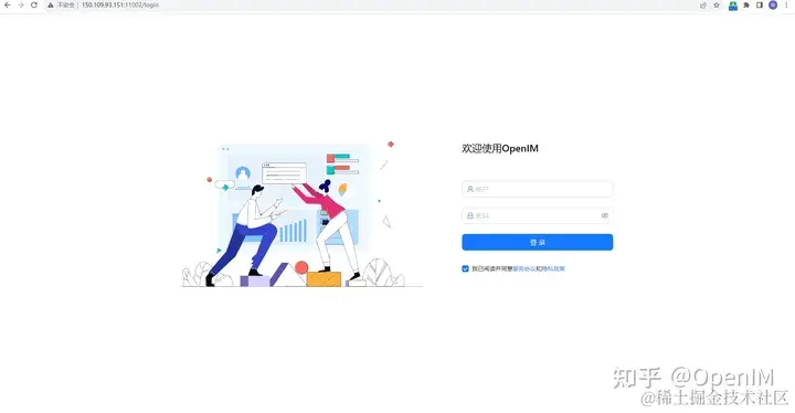 在浏览器中输入 http://ip:11002 来访问管理后台。此 IP 应为服务端 OPENIM_IP,确保您的浏览器能访问。默认账号和密码均为 chatAdmin。