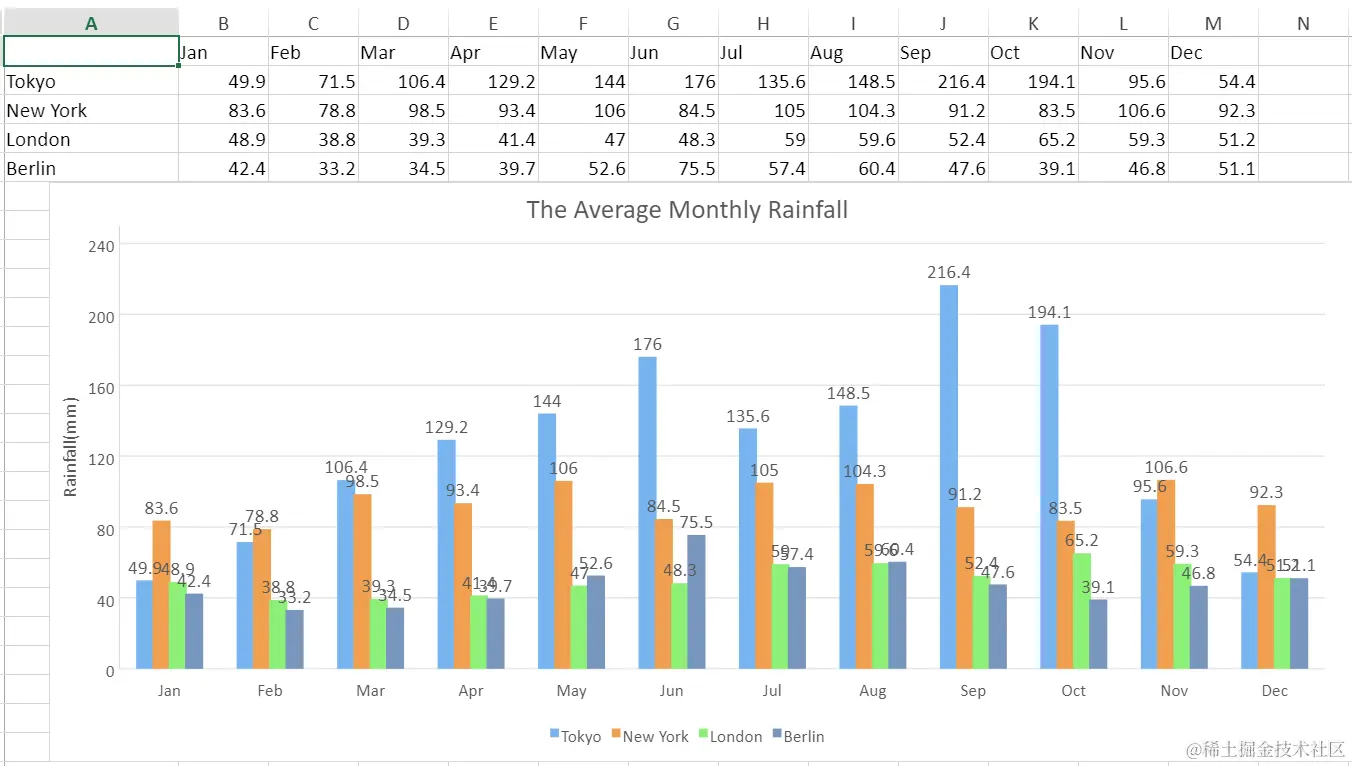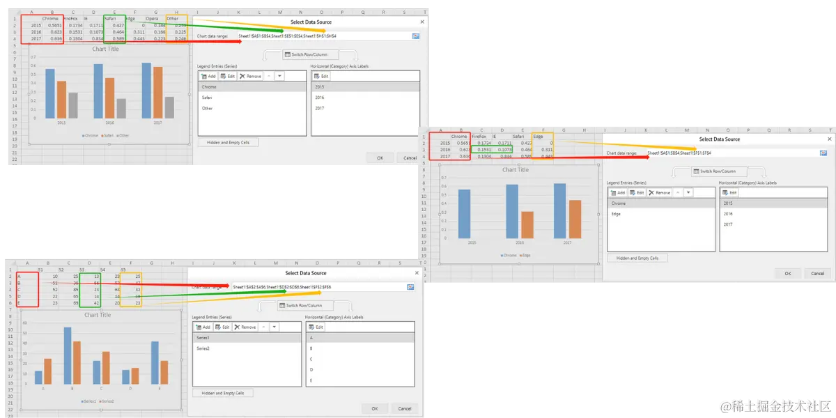 除此之外,SpreadJS还支持使用多选插入图表。除了选择连续的数据区域之外,还可以按 Ctrl 键选择多个不连续的区域来创建图表。也可以通过在每个范围之间放置逗号来在代码中指定多个范围: