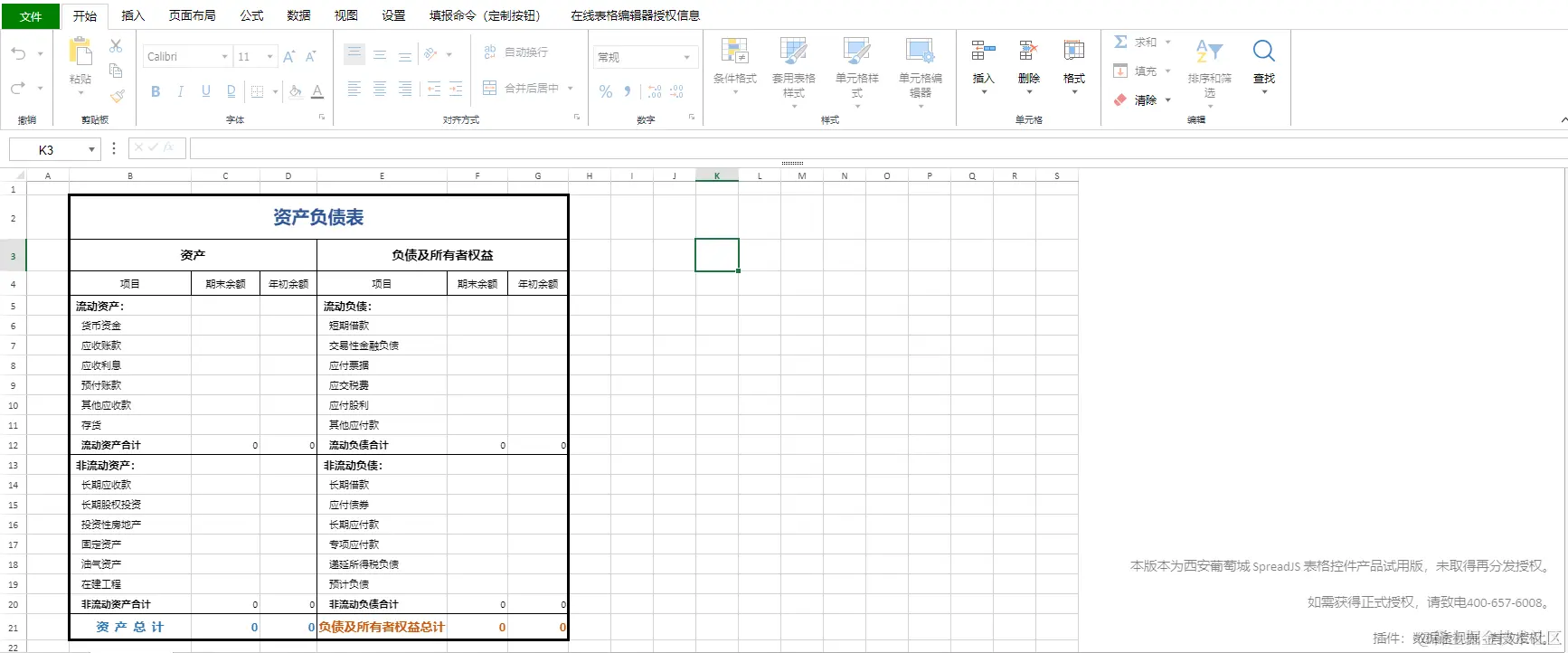 第一步(快速构建表格应用)中小编使用SpreadJS设计器创建了一个资产负债表,下面介绍如何在资产负债表中增加一个柱形图来美化图表: