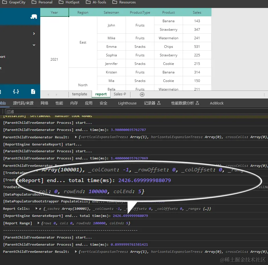 性能方面,在浏览器端,SpreadJS在2.4秒内可以完成10万行×6 列的分组交叉统计数据加载(不包含数据传输)