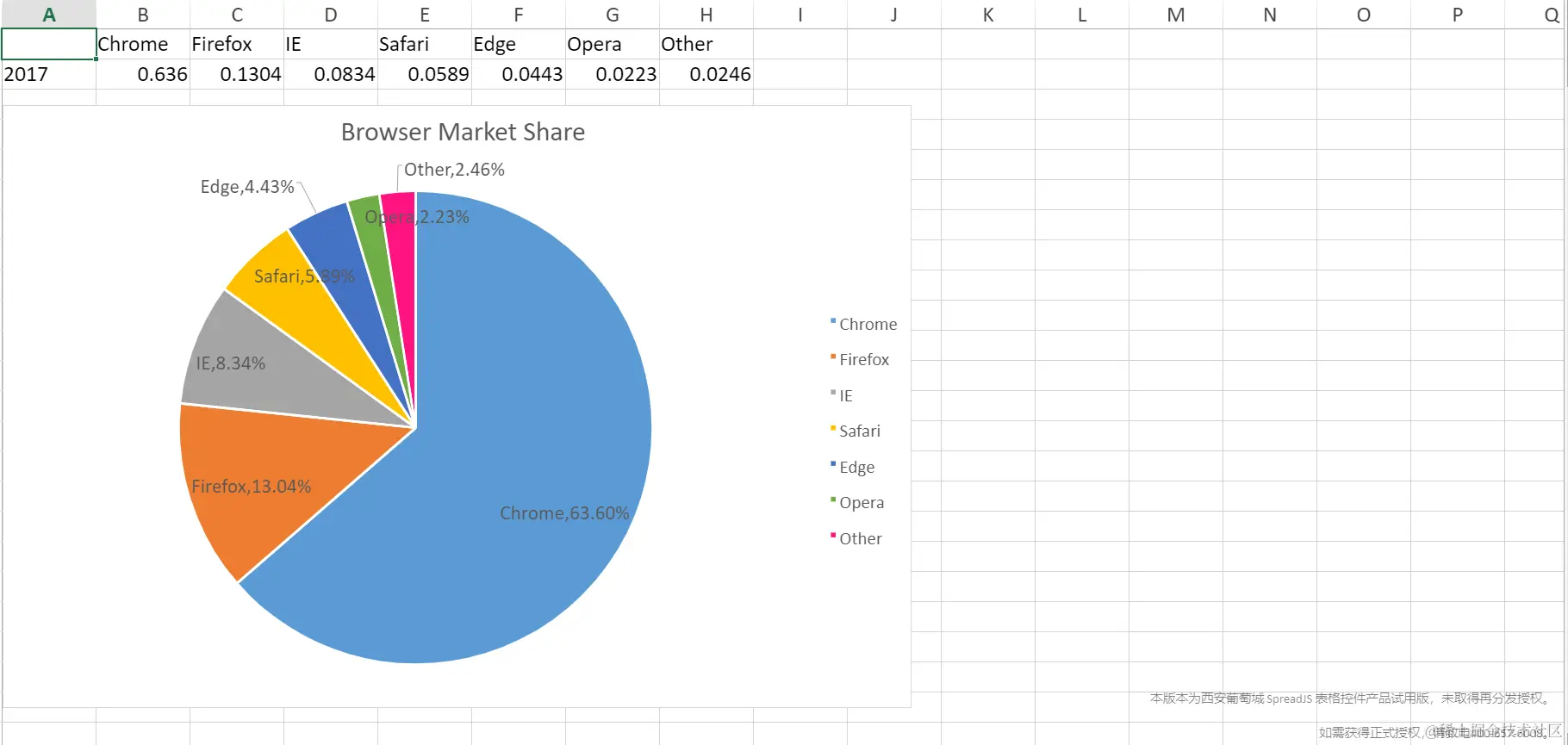 图表作为一种视觉化工具,在数据分析和可视化中起着重要的作用。它能够将复杂的数据和信息以直观且易于理解的方式呈现出来,帮助人们更好地理解数据的趋势、关系和模式。通过使用各种图表类型,如折线图、柱状图、饼图等,可以将数据转化为可视化的形式,使得数据更具可读性和可比性。同样的,在SpreadJS当中,也支持图表: