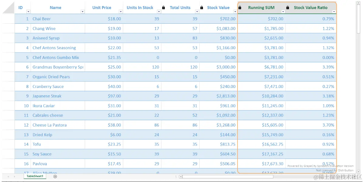 SpreadJS中的集算表支持从数据源添加字段,新版本还支持具有公式数据类型的虚拟列。之后可以在集算表的视图中使用这些公式列来显示运行总和或股票价值比率等内容: