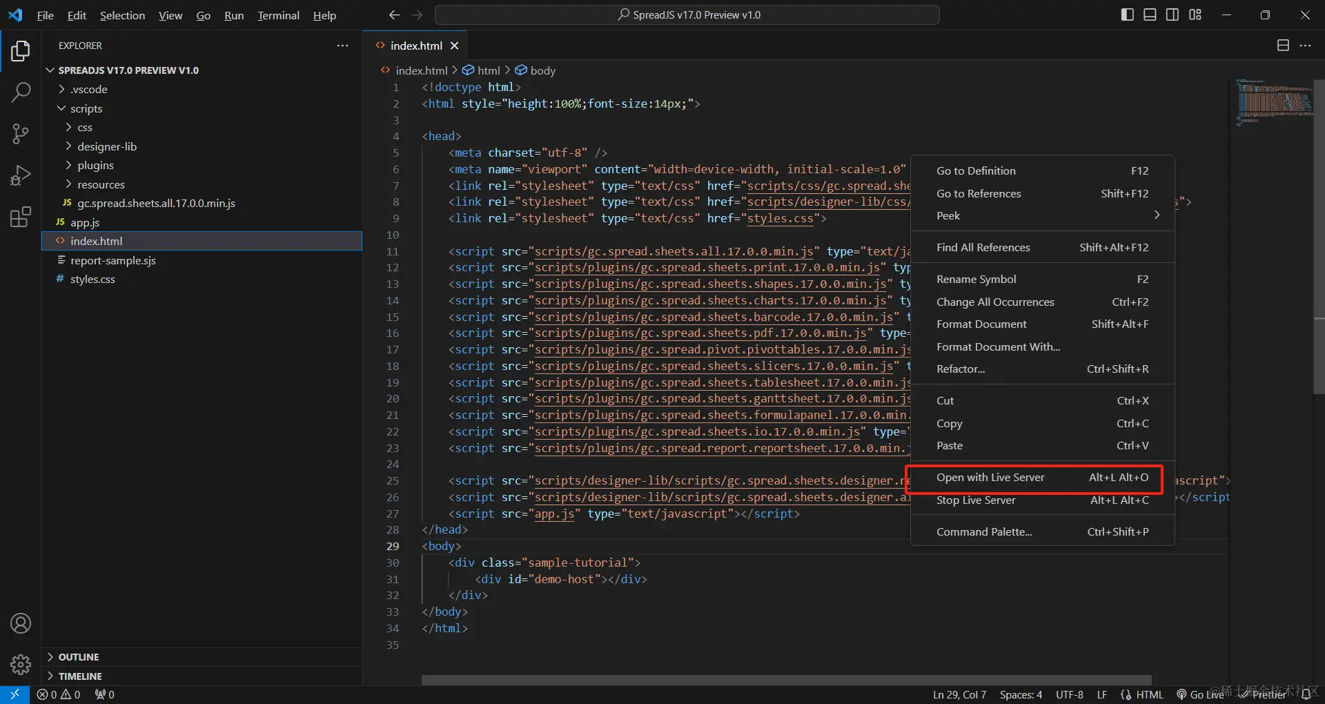 (4)打开文件中的index.html文件,右键点击Open with Live Server。