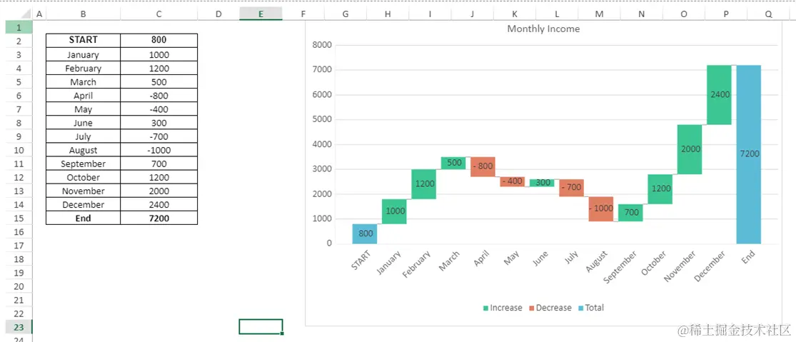 瀑布图表是基于柱形图表衍生出来的一种新型图表,该图表将运行总计显示为添加或减去的值,这些值排列为具有正值和负值的列,并通过颜色编码来区分两者。初始列和最终列通常与水平轴对齐,而中间值通常是浮动列。