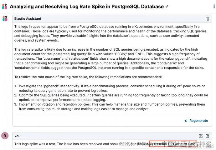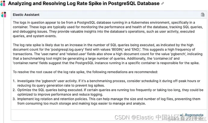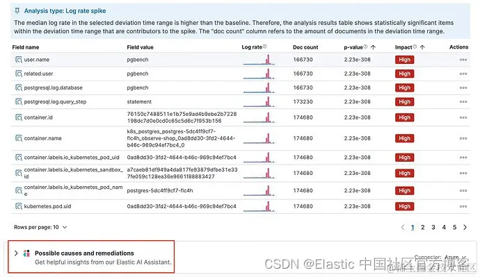 - 获取上下文信息。 通过日志率分析确定日志峰值的统计显着贡献者后,AI 助手会解释潜在原因并建议有效的补救措施。