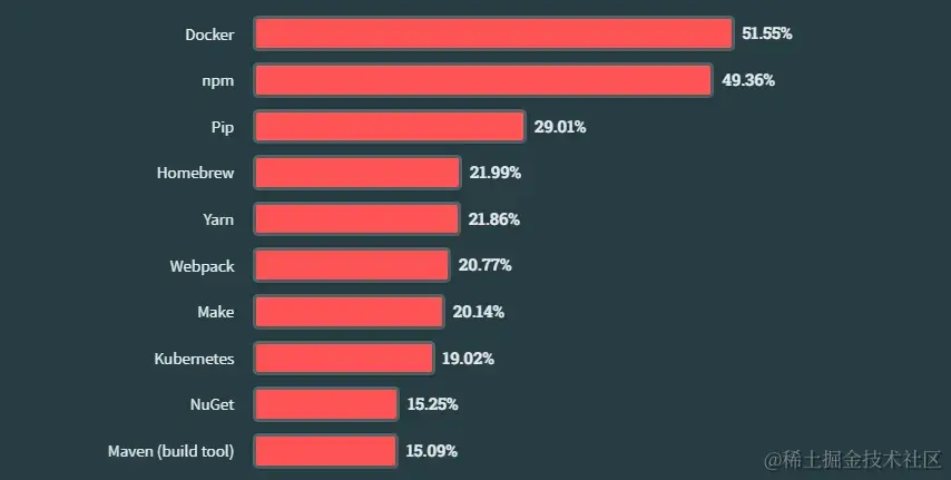 今年,Docker 是所有受访者中使用最多的其他工具 (53%),从去年的第二位上升。