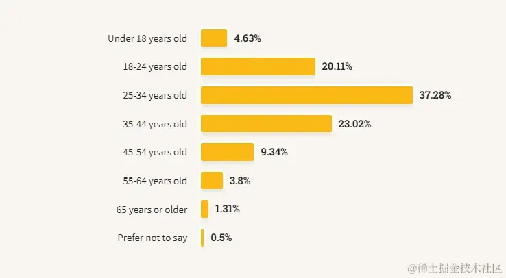 今年的受访者年龄分布略有上升,37% 的受访者年龄在 35 岁或以上,而去年这一比例为 31%。
