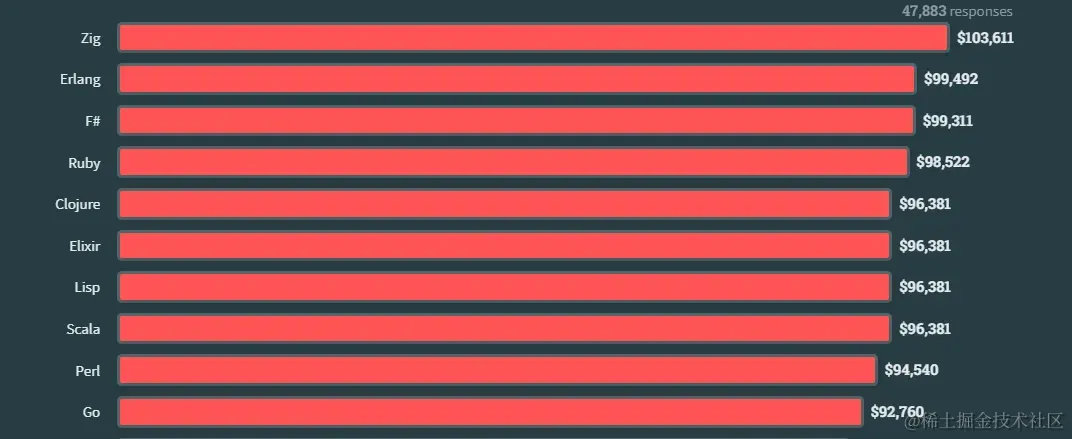 Zig 是今年收入最高的语言(新增),而 Clojure 则从榜首位置被挤下来,与 2022 年相比下降了 10%。