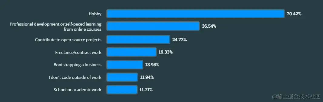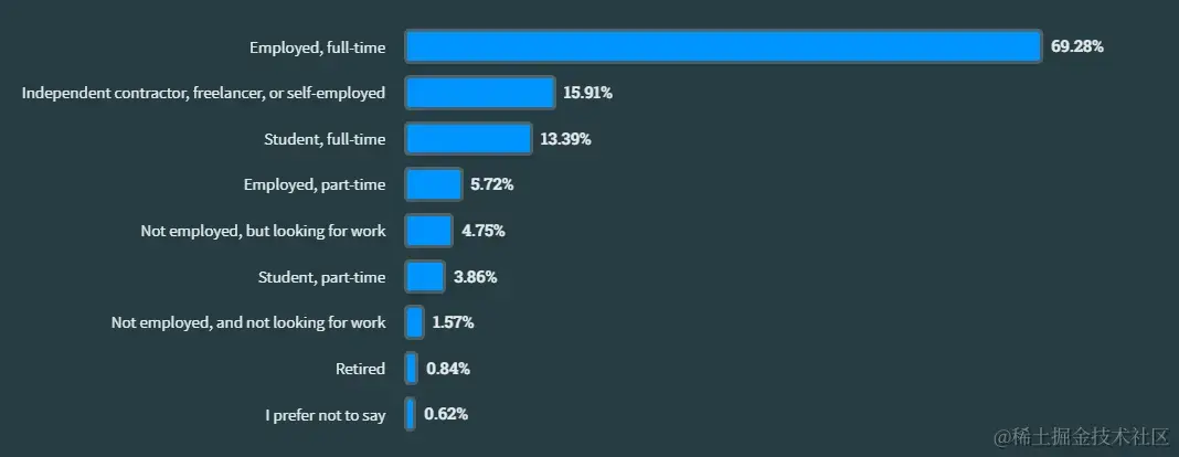 与去年相比,“独立开发者、自由职业者或自营职业者”的人数略有增加,而全日制学生的人数则有同等规模的下降(1 个百分点),而其他就业状况的变化则小于去年。