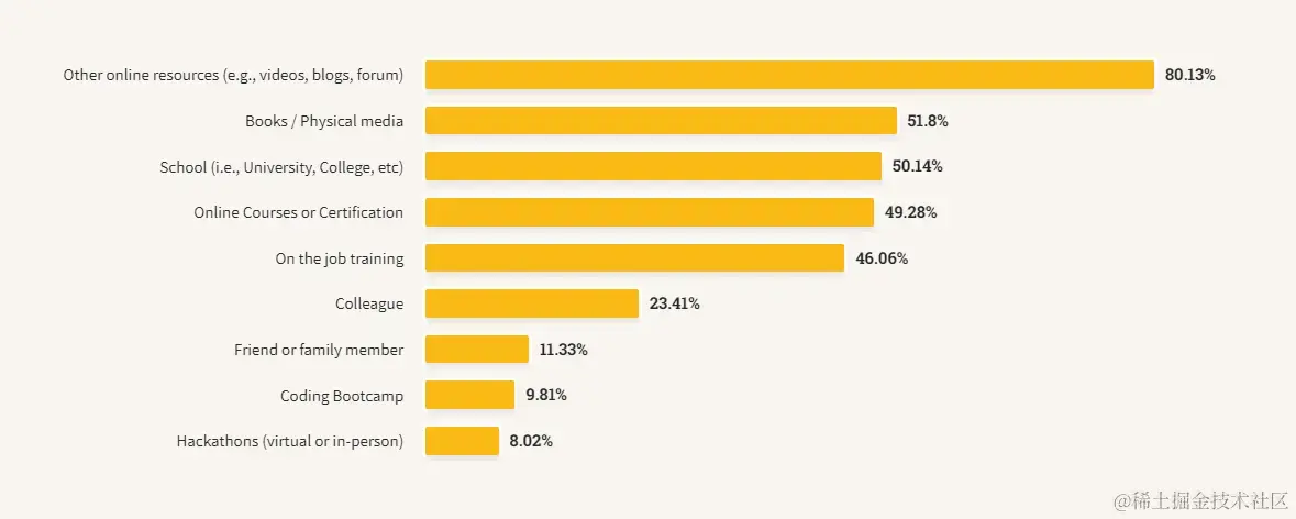 自 2022 年调查以来,通过在线资源学习编码的比例从 70% 增加到 80%。