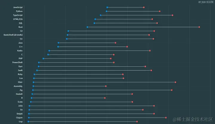 Rust 是最受推崇的语言,超过 80% 使用过它的开发人员希望明年再次使用它。将此与最不受推崇的语言进行比较:MATLAB。使用这种语言的开发人员中,只有不到 20% 希望明年再次使用它。