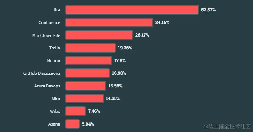 与去年类似,Jira 和 Confluence 是所有开发人员中排名前两位的异步工具,但今年该列表中的新成员打破了前三名:27% 的受访者使用 Markdown 文件作为异步工具。
