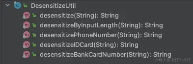 desensitize(String input):通用脱敏函数,支持对任意字符脱敏,将提取字符串中4位以上数字(如手机号、银行卡号、身份证号、数字验证码等)做脱敏;desensitizeByInputLength(String input):据字符串长度匹配不同的脱敏规则,如:11位则使用手机号脱敏规则,18位则使用身份证号脱敏规则;desensitizePhoneNumber(String phoneNumber):脱敏手机号,前3位和后4位,中间的数字用*代替;desensitizeIDCard(String idCard):脱敏身份证号, 保留前6位和后4位,脱敏7~15位生日信息, 用*代替;desensitizeBankCardNumber(String bankCardNumber):脱敏银行卡号, 前6位和后4位,中间的数字用*代替。
