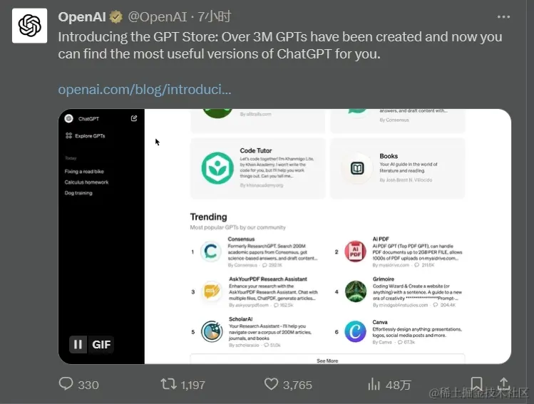 2024年1月10日ChatGPT开始向ChatGPT Plus、Team和Enterprise用户推出GPT Store,让用户可以找到有用且受欢迎的GPTs。官方有提到在他们宣布GPT以来已经两个月,用户已经创建了超过300万个ChatGPT的定制版本。今天用户可以在GPT Store应用商店网站上浏览和下载各种GPTs应用,也可以上传和出售您自己创建的GPTs应用。