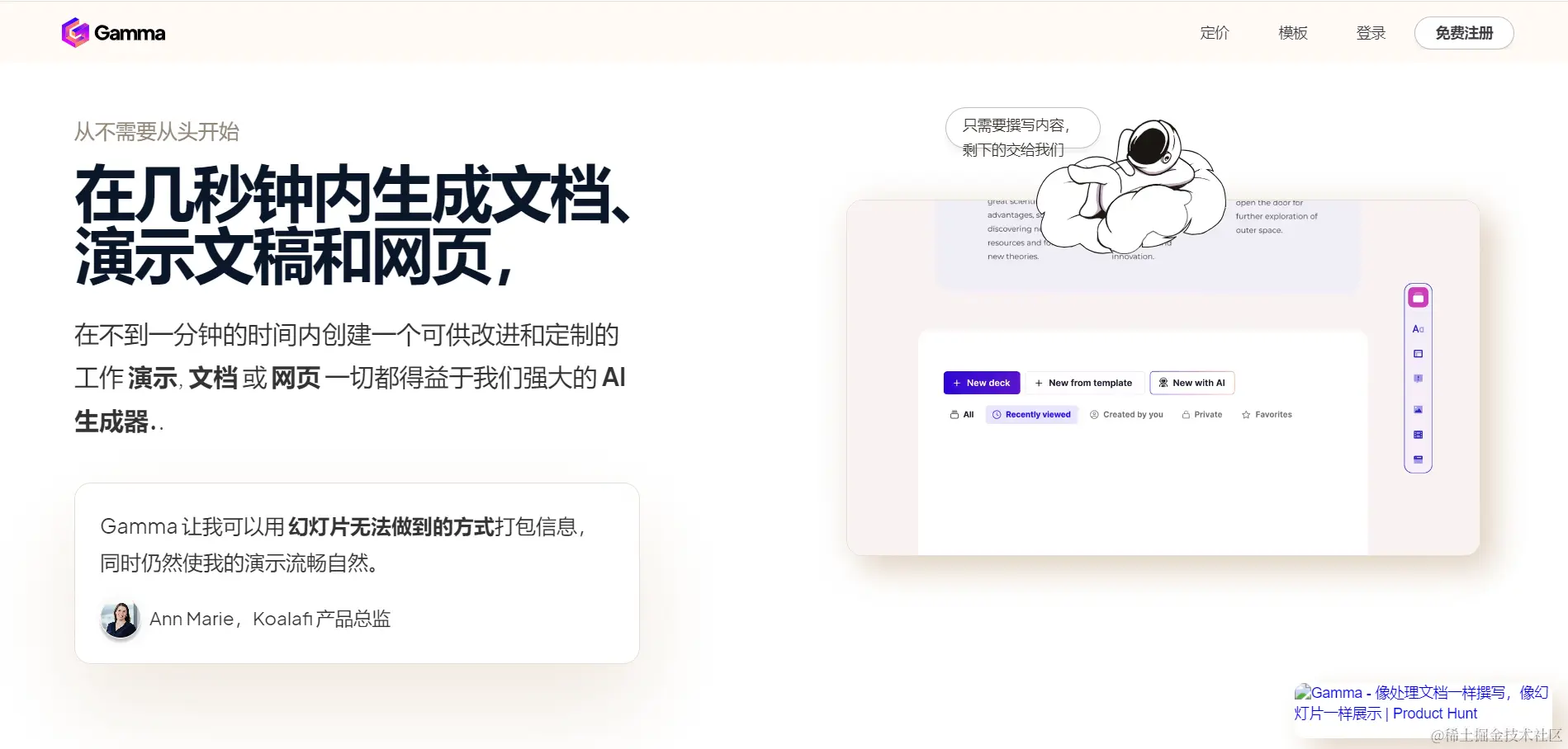 Gamma 是幻灯片的替代品 - 一种快速、简单的方式来分享和展示您的作品。创建易于现场讨论或异步共享的引人入胜的演示文稿、备忘录、简报和文档。全部在您的浏览器中,无需下载或安装。