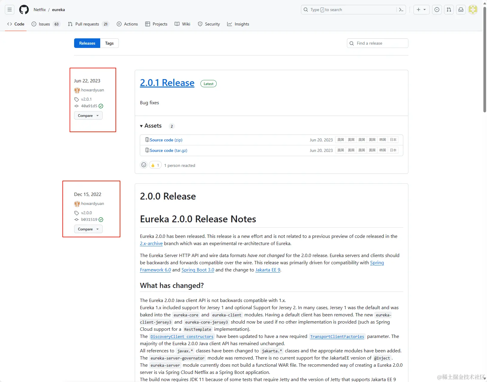 这就是标题党误导读者形成的一个心理暗示。实际上 Eureka 官方只说过 Eureka2.x 不再维护。官方原文:github.com/Netflix/eur…官方说的是 Eureka2.x 不再维护,但Eureka1.x 仍在积极维护,翻阅 Github 就能发现 1.x 最新的发行版是 22 年 12 月。并不是没人维护了。