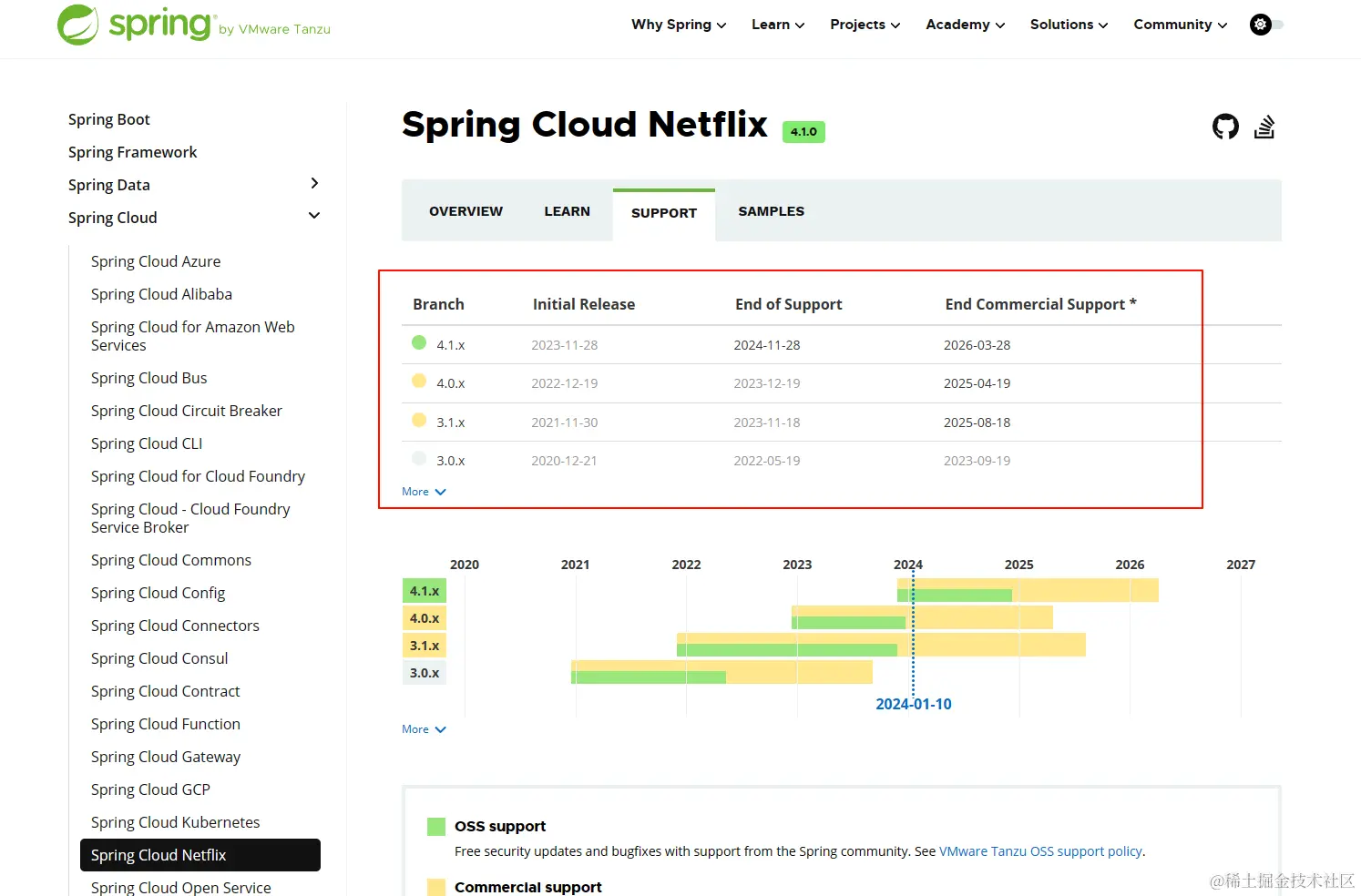 既然Eureka一直有人在维护,那SpringCloud Eureka呢?不妨也查看一下官网信息:SpringCloudNettfix 官网查看版本信息 spring.io/projects/sp…,从下图可以看出,最新的版本是23年11月28日发行的。并且商业支持到26年!(当前时间24年元旦)所以SpringCloudNetflix系列官方都还在积极维护,使用者更不必担心了。