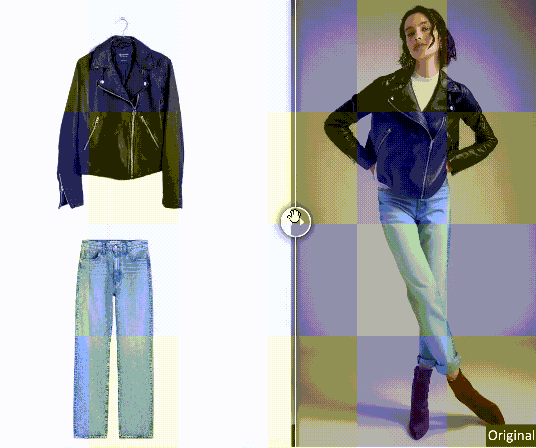 可以在保留服饰基本属性基础上,Refiner模型显著提升服饰的材料质感,模特的皮肤真实度。