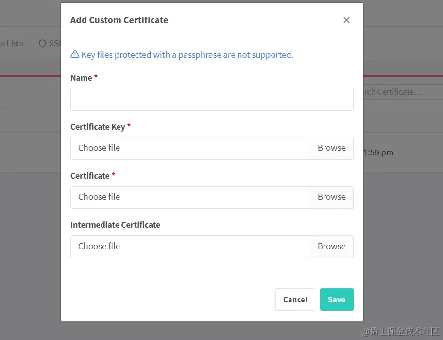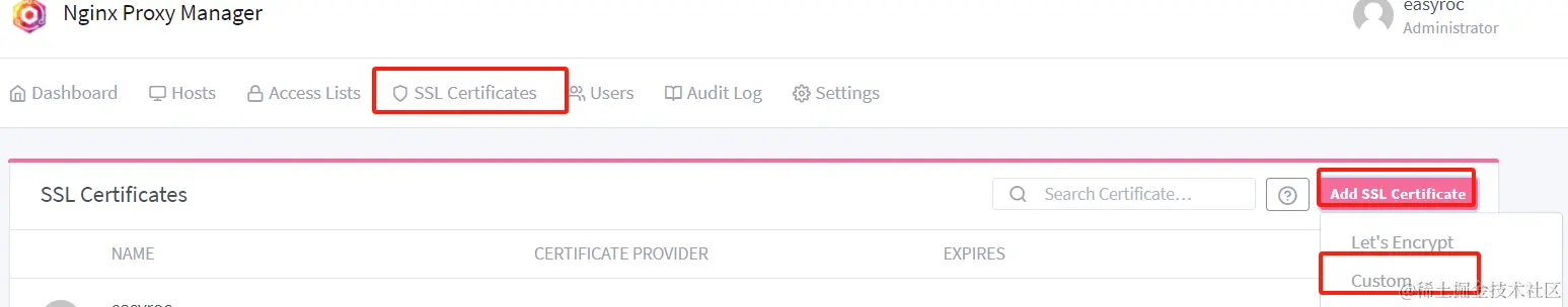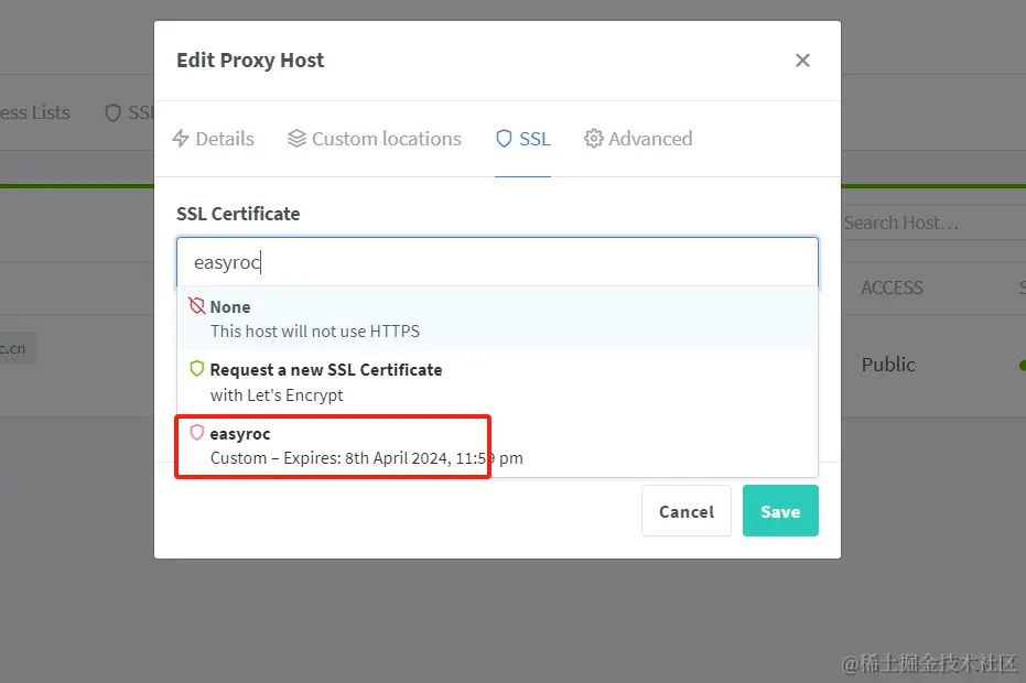- 添加好了之后,回到Proxy Hosts列表,重新配置Proxy Host,SSL选择刚刚手动添加的证书,保存