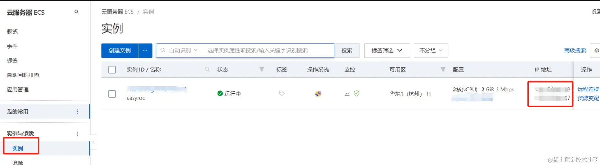 - 可以查看自己的实例信息,"IP地址"栏显示公网和内网IP;
