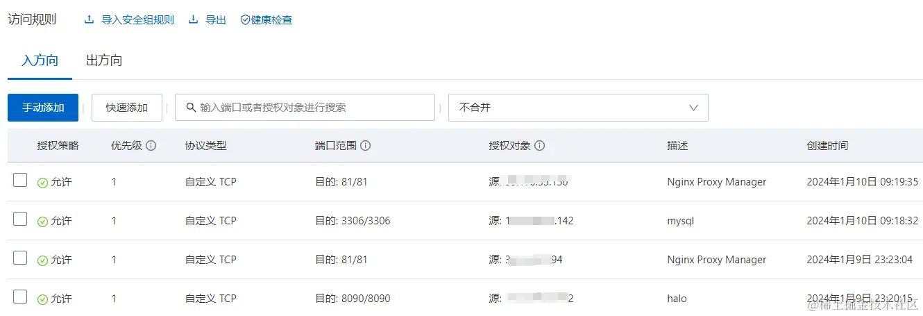 - 业务安全组如下图:将入方向3306,81,8090端口放开,后续安装halo需要用到;