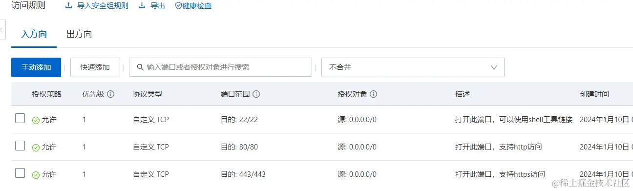 - 基础安全组如下图:将入方向的22;80;443放开;