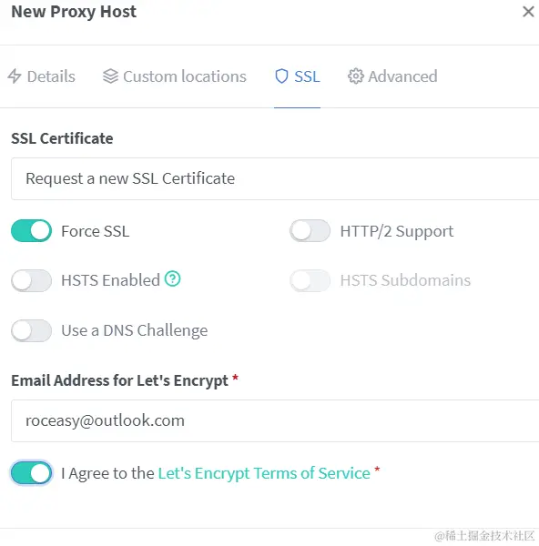 Nginx Proxy Manager 后台还可以一键申请 SSL 证书,并且会自动续期,方便省心。