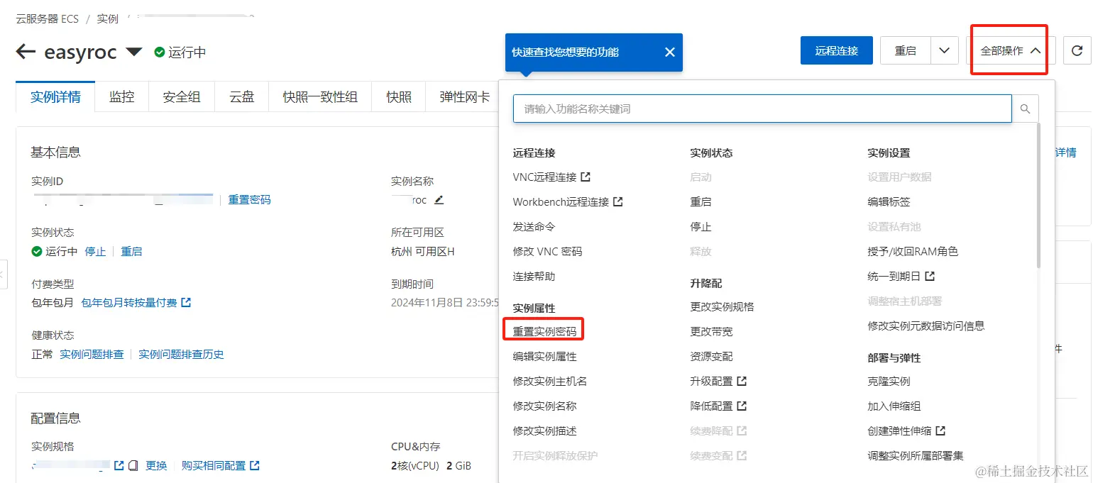 - 打开实例,建议把你的实例账户密码重置一下;
