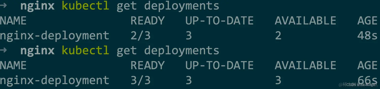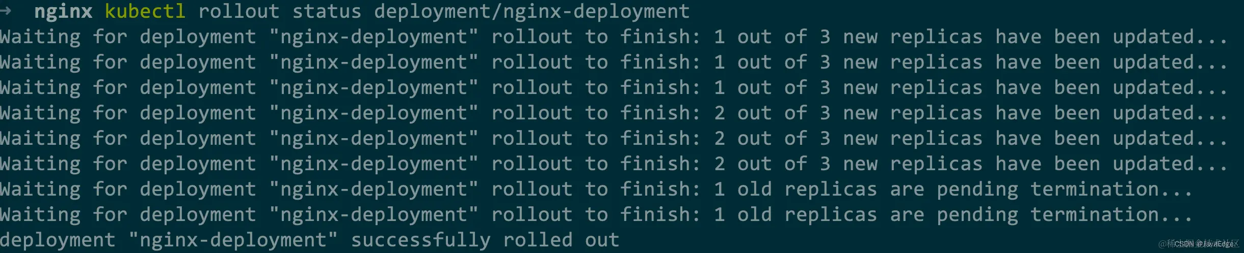 通过kubectl rollout status查看nginx-deployment的状态变化: