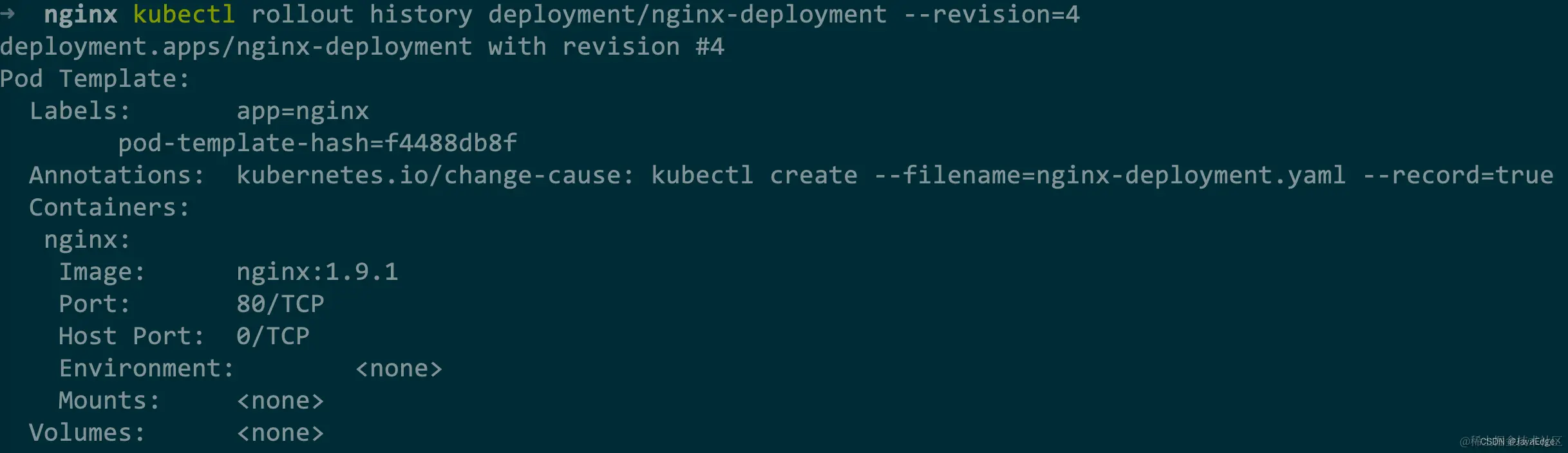 而由于我们在创建这Deployment时,指定了–record参数,所以创建这些版本时执行的kubectl命令,都会被记录: