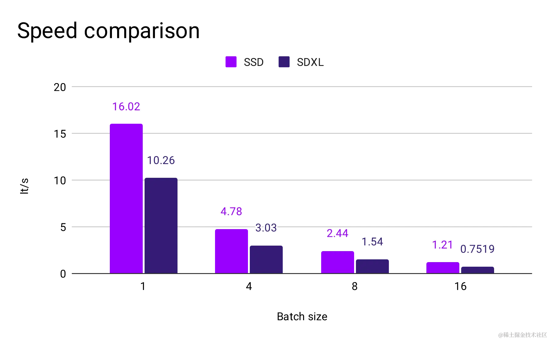 - 速度基准,与SDXL模型相比,SSD-1B的加速显而易见。速度提升高达60%,该模型在不同GPU配置上展示了高效性,使其成为硬件设置的实用选择。