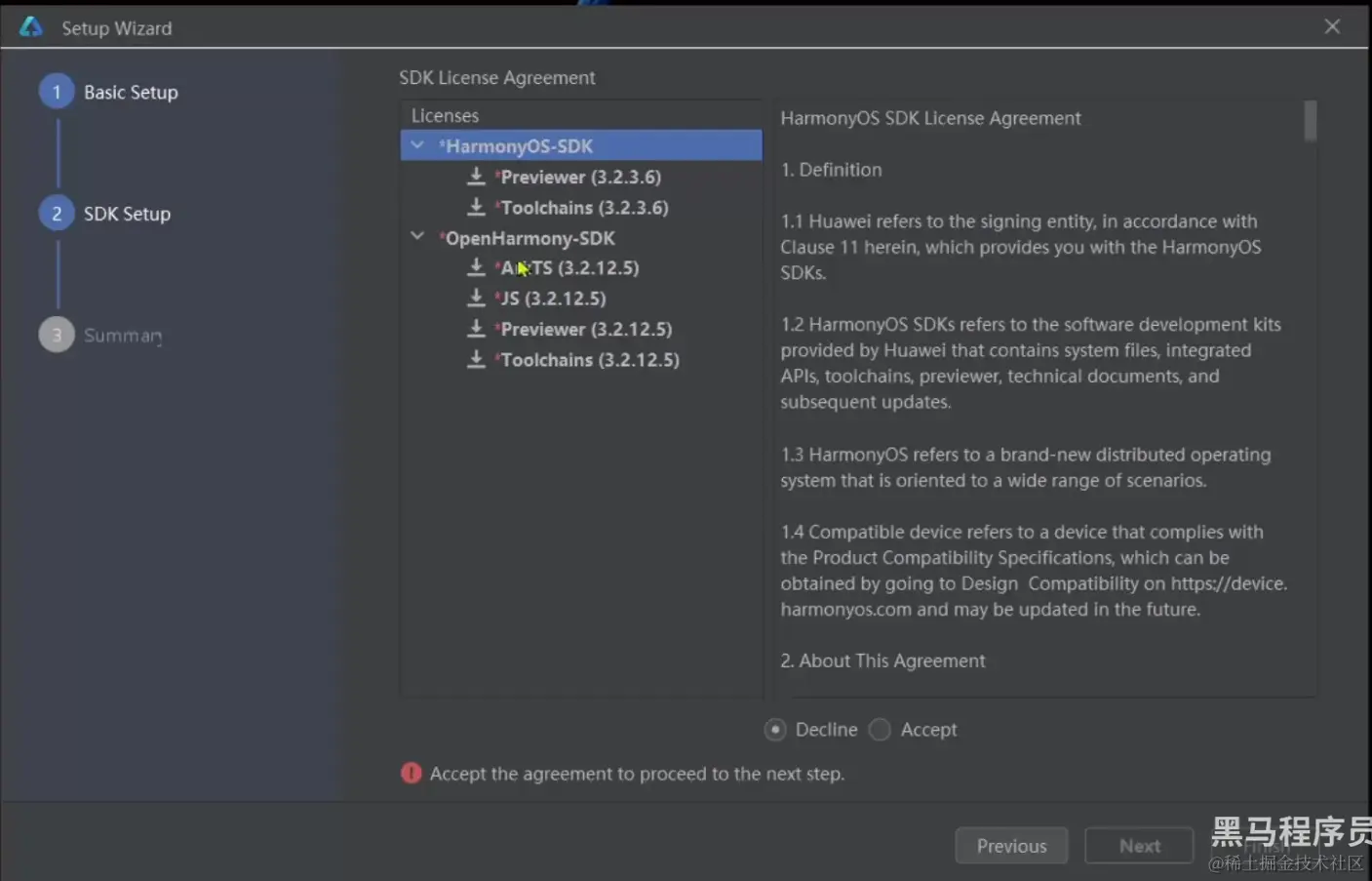 - 接着这部分是关于鸿蒙 SDK 协议的选择,直接 Accept 即可