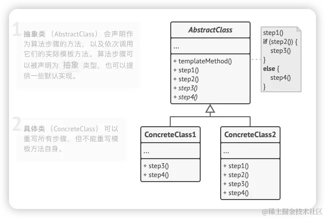 定义: 模板方法设计模式是一种行为设计模式,它在一个方法中定义了一个算法的骨架,将一些步骤的执行延迟到子类中。这样,子类可以在不改变算法结构的情况下重新定义算法的某些特定步骤。