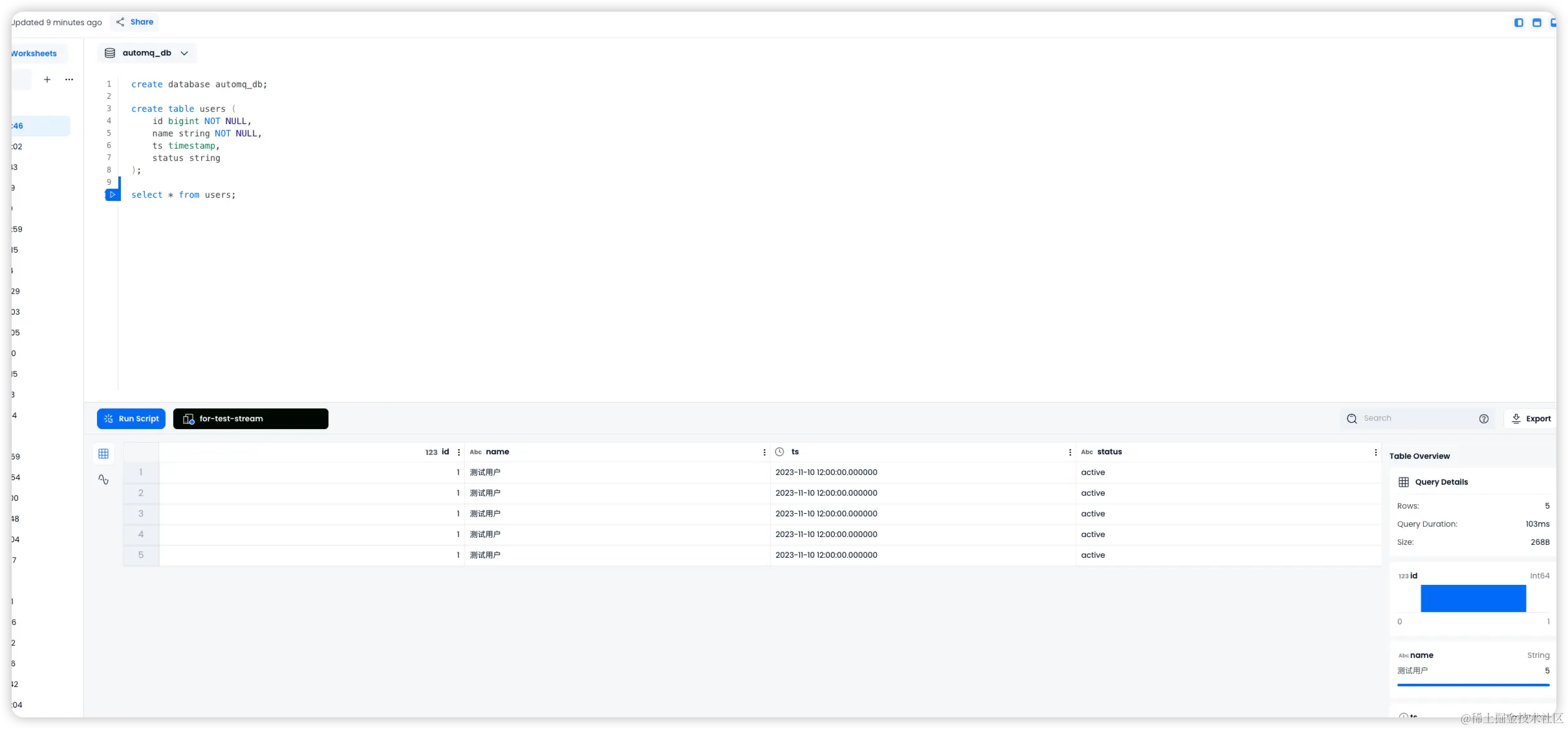 到 Databend Cloud worksheet 中查询 automq_db.users 表,可以看到数据已经从 AutoMq 同步到 Databend Table。