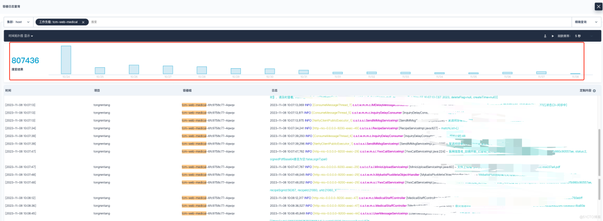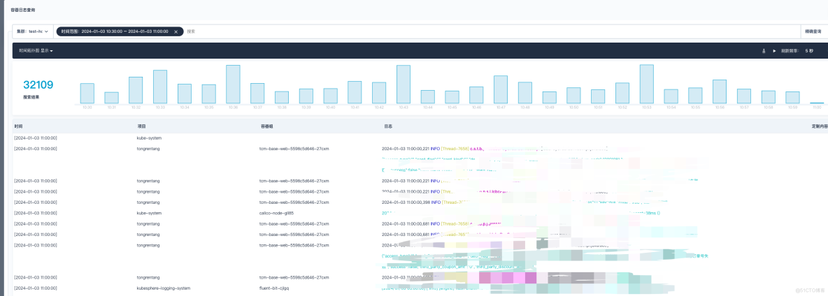 修改完毕之后,随后进行验证日志是否正常展示。参数大小一定要根据自己生产环境的配置进行调整,如果服务器节点性能配置不是很高,那么参数调整之后会严重影响业务,造成 Node 节点负载过高,本人因为这个调整被狠狠地坑过一次。下方截图是当时触发了告警,因为参数调整之后,大量的日志疯狂的刷新,导致节点流量带宽以及负载暴涨。